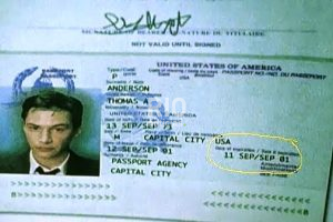 Una curiosidad, advertida sólo por los fanáticos de la película: el pasaporte de Neo, mostrado una sola vez en la película tiene una fecha de expiración inquietante: el 11 de septiembre del 2001, día del terrible atentado a las Torres Gemelas. Recordemos que la película fue filmada dos años antes, en 1999.